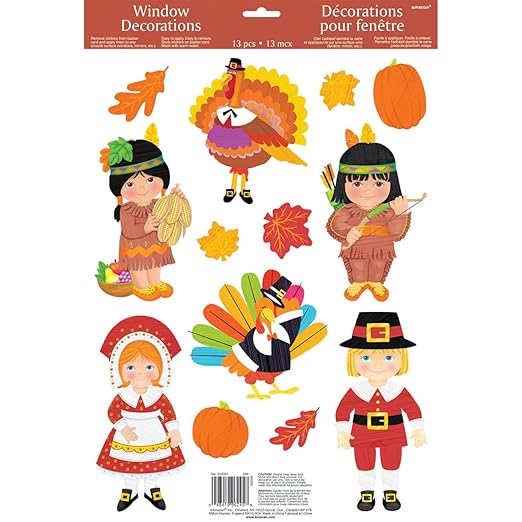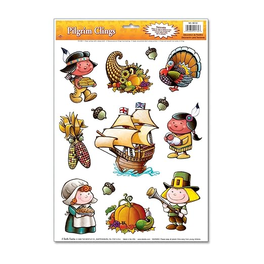 Beistle 99132 Pilgrim Clings (13 Count). The sheet includes 13 pieces of window clings in assorted sizes, shapes and designs of pilgrims, Indians, a turkey, a pumpkin, Indian corn, a cornucopia, a Mayflower ship and acorns. The sheet measures 12 Inch wide by 17 Inch tall.