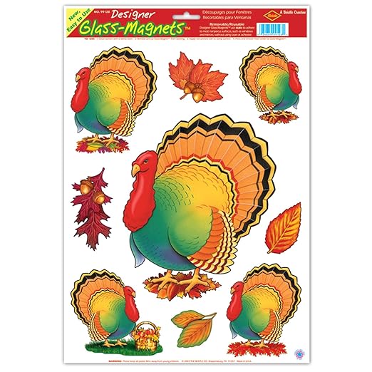 Beistle 99128 Thanksgiving Turkey Clings (5 Count). The sheet includes 5 pieces of window clings in assorted sizes, shapes and designs of turkeys and leaves. The sheet measures 12 Inch wide by 17 Inch tall. Great for windows in homes, offices or schools!.