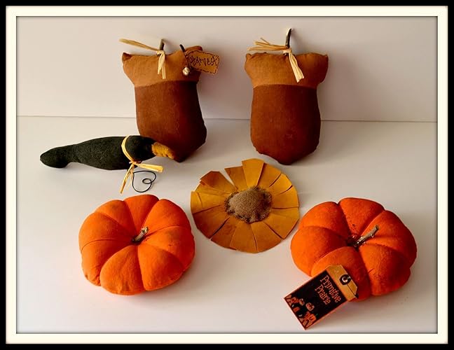 The corn,leaves,squirrel and Acorn ornies are made from Chestnut Junction Patterns. The Pumpkin Ornie is made from Megans Primitive Cupboard Pattern. They are all made out of muslin that was painted and then coffee stained.The corn and pumpkin are also smeared with cinnamon.The set includes- one pumpkin which measures approx.3by 4 in.one corn approx.8.5 in.one squirrel approx. 7 in.one acorn approx. 5 in.and three leaves that are approx.4 in. Bowl not included. They are stuffed with a mixture of polyester and cotton fillings. They are not a toy and for decorative purposes only.