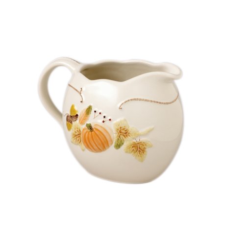 A celebration of the abundance that is autumn, Plymouth features embossed pumpkins, acorns and ears of corn on a warm, creamy white surface. Sculpted acorn finials finish the lids of hollowware pieces. Platters and plates feature scalloped rims accented with gently flowing, weathered line. A simple, lovely harvest pattern, Plymouth is ideal for Thanksgiving or any autumn entertaining occasion. Plymouth gravy/sauce pitcher Gravy/sauce pitcher holds 20 ounces, 4-1/2" high x 6-1/2" long Made of hand-painted stoneware Pattern features sculpted and embossed vegetable, fruits and acorns all on a creamy white background Microwave, dishwasher and oven safe
