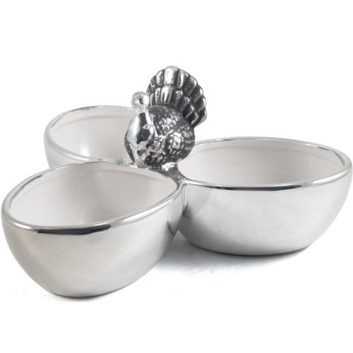 Hand painted earthenware, 3-sectioned bowls separate foods, Held together with a festive turkey perched in the center, Perfect for Thanksgiving festivities, Hand wash