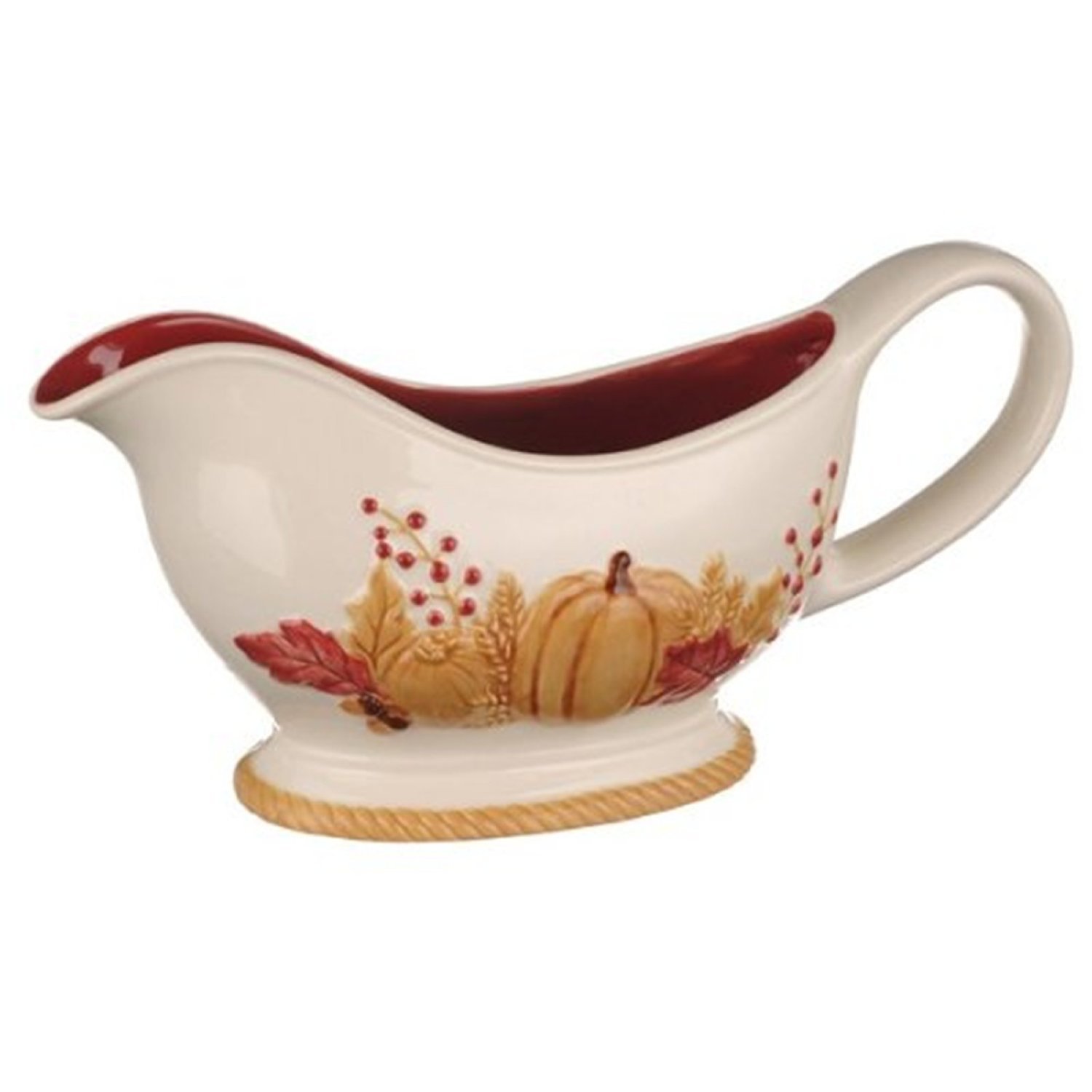 2 -piece gravy boat set White on white autumn harvest design Perfect for any family gathering or dinner Microwaveable for reheating only Dishwasher safe
