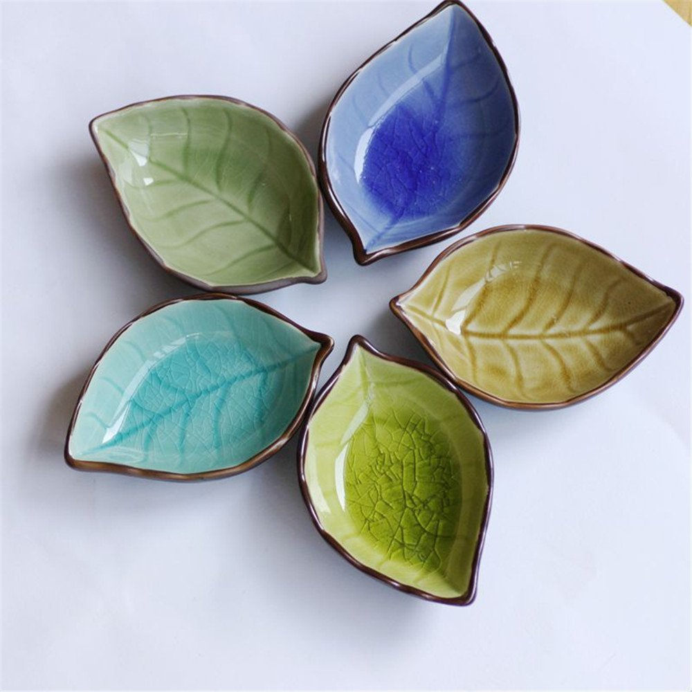 Includes 5 of 4 inch ginko leaf shaped bowls Ginko leaf colors are yellow, green, blue, orange, and purple Hand painted Japanese stoneware NOTE, since the stoneware is hand painted, each piece is unique and may differ slightly from photo Set of 5 bowls at around 4 inches in diameter 34