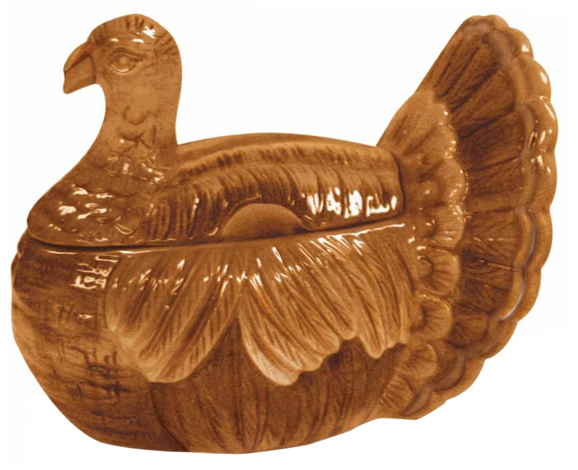 Turkey shaped gravy boat with lid by artist Paul Brent 7.5-Inch long x 5.5-inch wide and stands 6.25-Inch tall 24-Ounce turkey bowl and lid made of sturdy stoneware with food safe transparent glaze Paul Brent designed gift box with images on how to creatively use and enjoy this holiday season