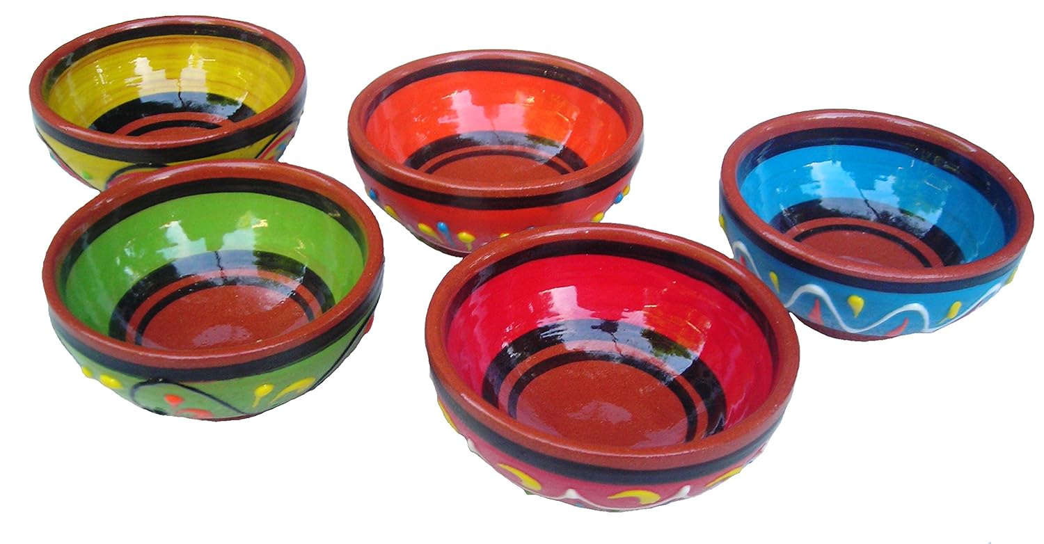 Set of 5 Mulit-Colored Mini-Bowls for Condiments or Spices Hand painted in Andalusia, Spain These bowls are small & beautiful! The measures approximately 2.75" across top. Dishwasher, microwave and food safe The mini-bowls are small. We offer 3 sizes of bowls, the mini-bowls, salsa bowls and breakfast bowls.