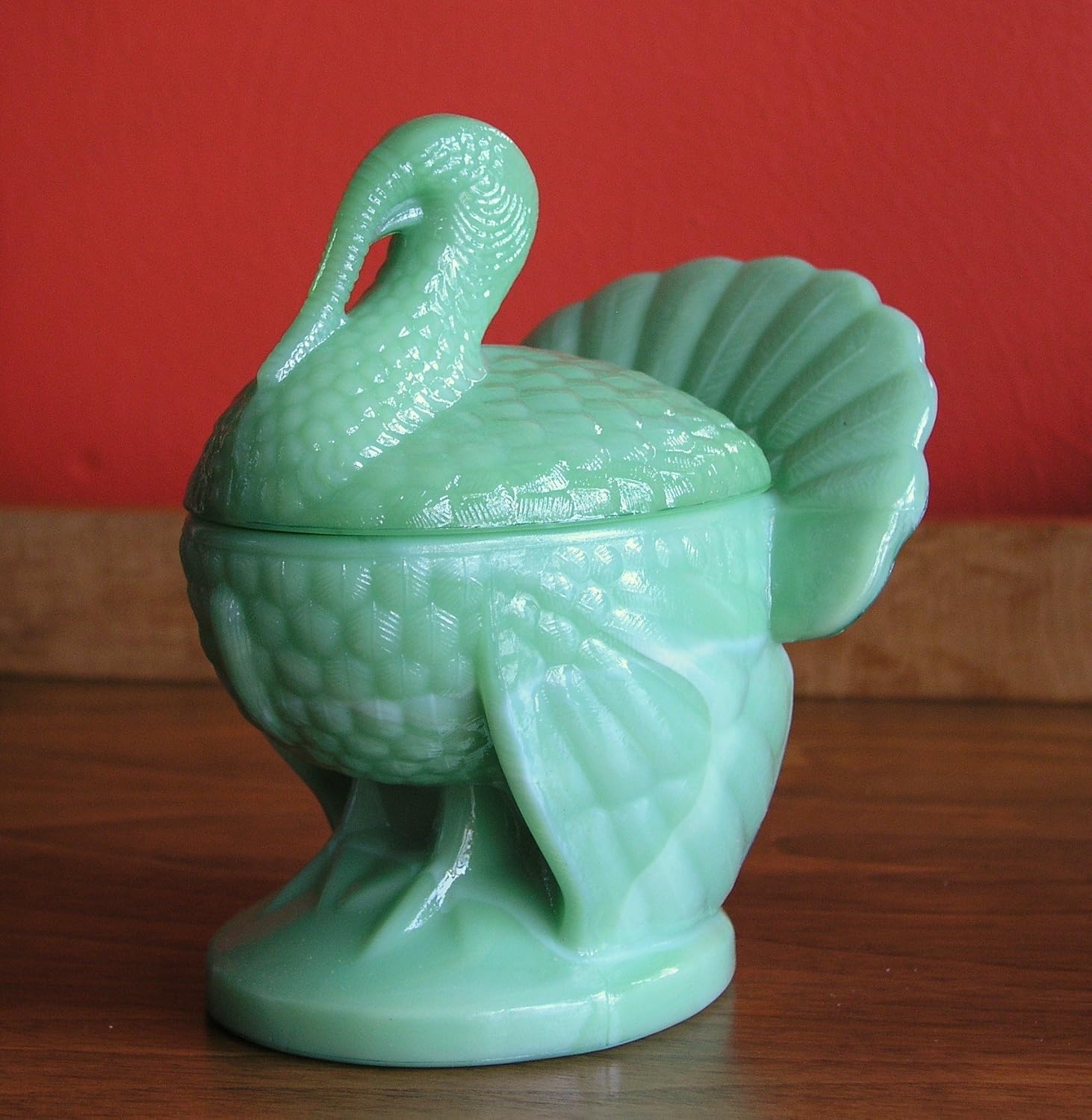 No matter how you decide to use or display your Jadeite colored Turkey covered bowl; whether serving cranberry sauce on Thanksgiving Day or using it as a soup bowl to serve up some Pumpkin Squash soup. You'll enjoy the rich detail and heaviness of the thick glass in this beautiful turkey coverd bowl This is handmade glass and is extremely unique in character. The green milky swirl is almst a slag green glass. A rare piece now