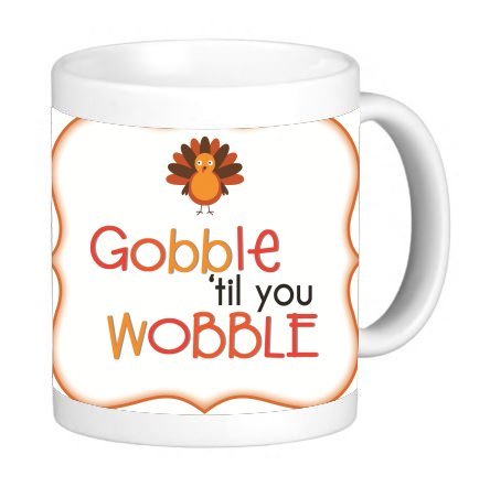 Happy Thanksgiving gobble with a picture of a cute turkey Mug is available in both 11 oz. and 15 oz. Why drink out of an ordinary mug when a custom printed mug is so much cooler? This ceramic mug is lead free, microwave safe and FDA approved. Image is printed on both sides. Hand washing is recommended. 30